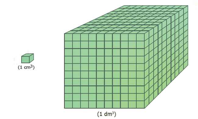 Perhatikan kubus satuan di bawah! Gambar sebelah kiri menawarkan 1 kubus satuan yang memiliki rusuk 1 cm, sehingga volumenya 1 cm³. Pada gambar sebelah kanan terdapat kubus besar yang disusun dari kubus satuan yang volumenya 1 cm³. Kubus besar tersebut disusun dari 1.000 kubus satuan dengan volume masing-masing kubus satuan 1 cm3. Dari gambar di atas diperoleh bahwa 1 dm³ = 1.000 cm³.
