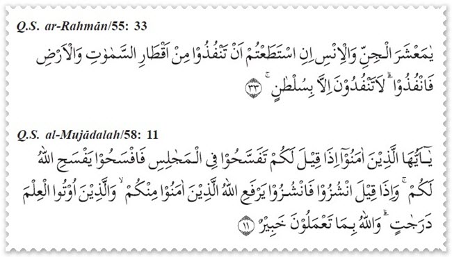 “Wahai golongan jin dan manusia! Jika kau sanggup menembus (melintasi) penjuru langit dan bumi, maka tembuslah. Kamu tidak akan bisa menembusnya kecuali dengan kekuatan (dari Allah) ” (Q.S. ar-Rahman/55: 33)